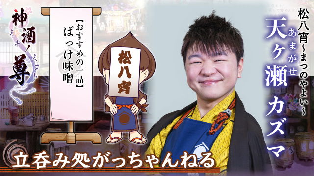 初めまして!フリーで活動しております、天ヶ瀬カズマ(あまがせ かずま)と申します! この度、松八宵の栗を担当させていただきます。基本的にはキッチンから立った状態で配信をさせていただく予定です。 一緒に笑いながら美味しいお酒を呑みましょい♪ |