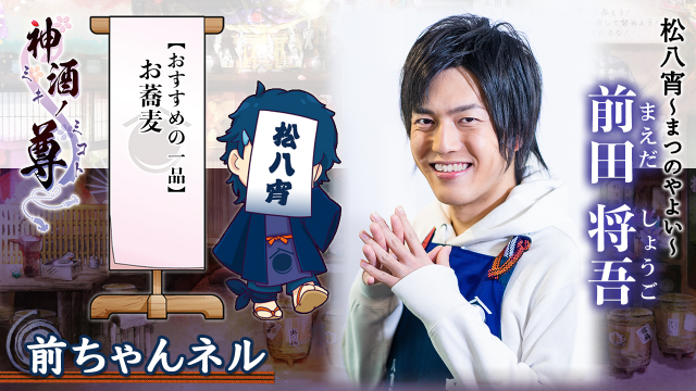 初めまして松八宵「藍色」担当!“前ちゃん”こと、前田将吾(まえだ しょうご)です。 前ちゃんネルでは、のんびりしながら日本酒の事をより深く知っていくゆる~~い配信を心掛けて行きます!夜に配信予定なので寝る前に覗きに来てくれると嬉しいです! 一緒に松宵庵を盛り上げて行きましょ~! |