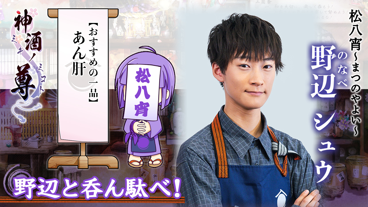 はじめまして٩(˙▿˙)۶この度、松八宵【紫色】を担当させて頂くことになりました、野辺シュウ(のなべ しゅう)です!! フルーティーな日本酒が好きで、一押しのおつまみはあん肝!! 皆さんと一緒に神酒ノ尊を盛り上げていきたいと思いますのでよろしくお願いします◎ |